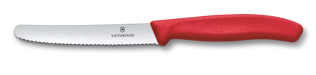 These Victorinox Tomato Knives, with their high quality serrated stainless steel blade and ergonomic non-slip handle, are ideal for cutting tomatoes and a range of other vegetables and other foods. The serrated blade of this knife is designed for easy cutting using the minimum of force, even after other knives would have gone dull, making it both practical and long lasting; while the 5" blade length means that they are suitable for the most delicate of tasks. Available with red, black, and white handles.